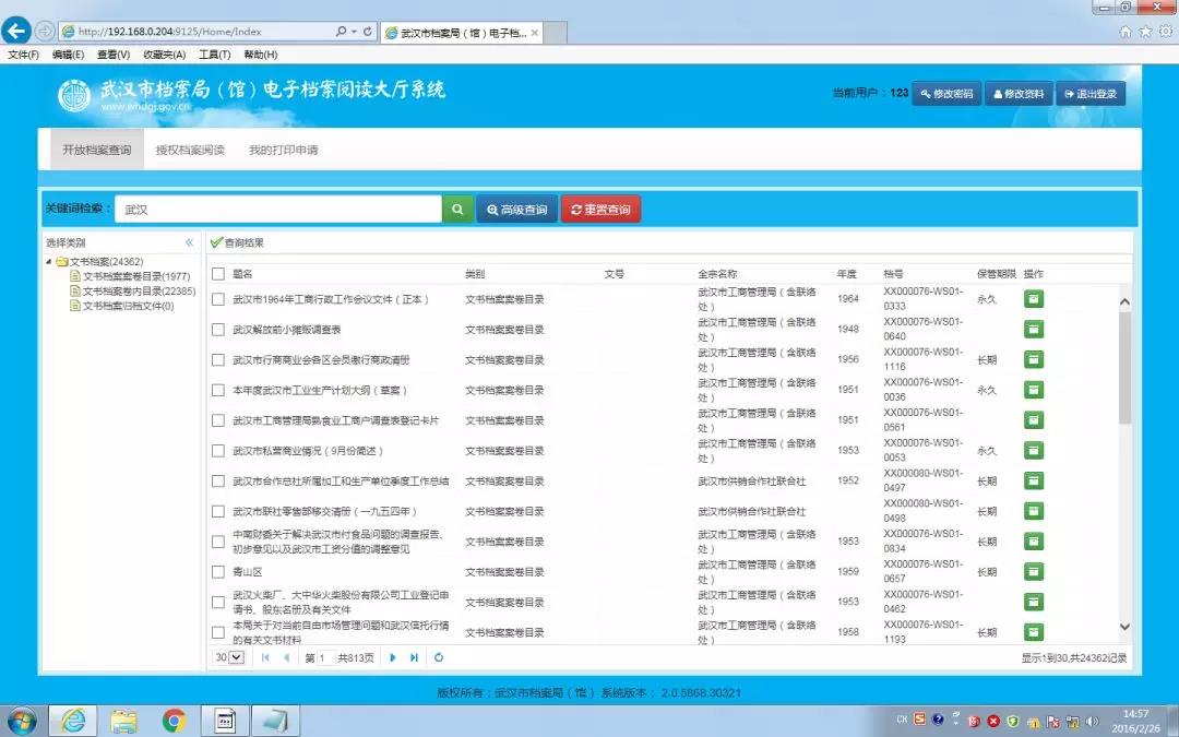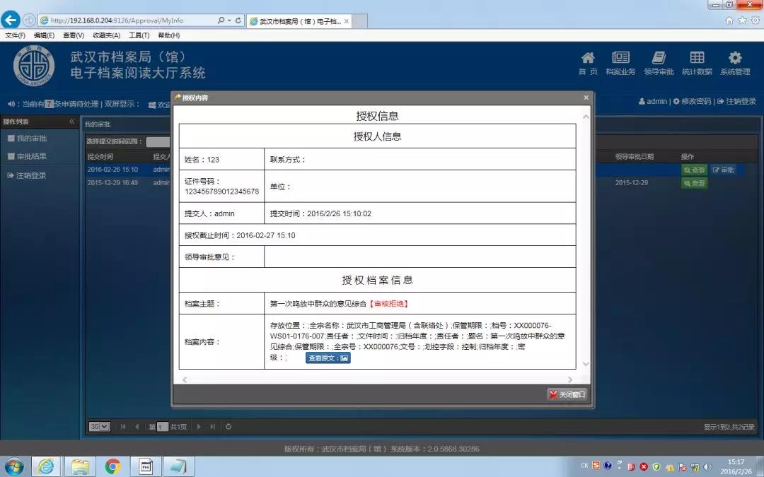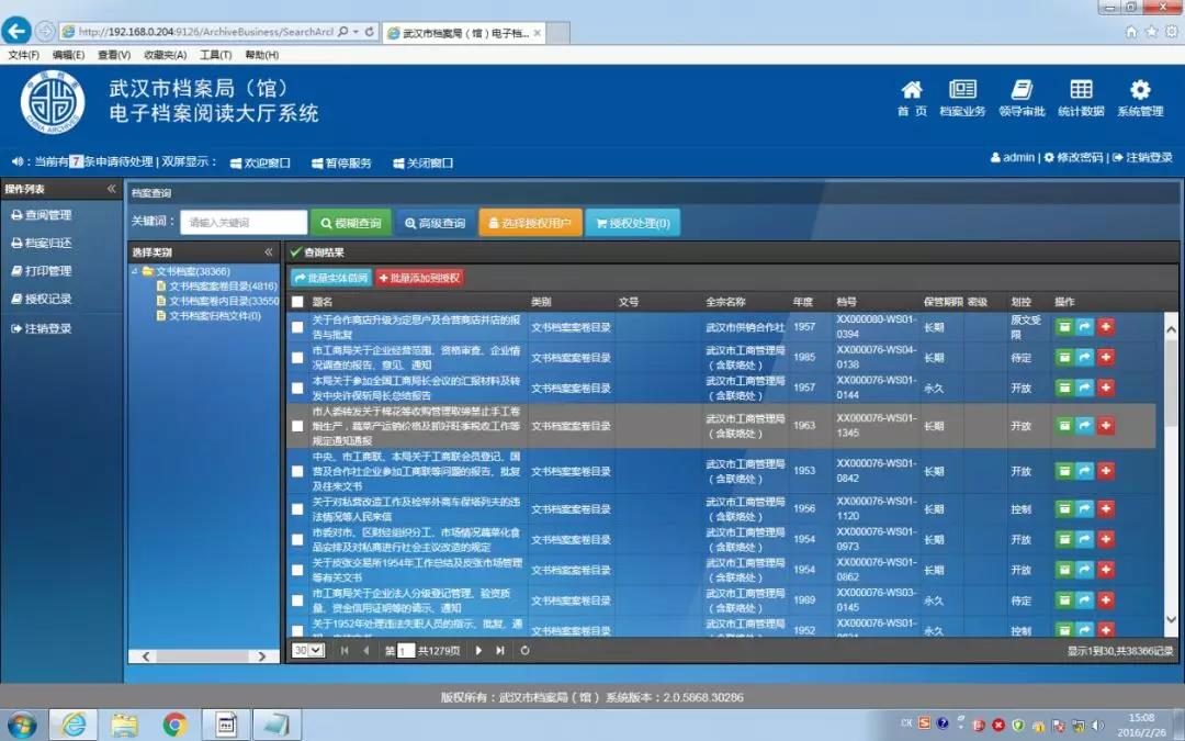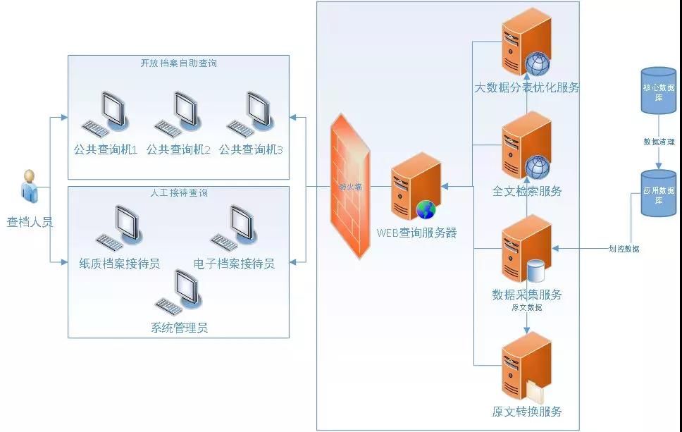 系统根据档案局(馆)档案查询业务办理的工作实际情况,将传统手工登记、纸质目录查阅、人工调卷转变为计算机全程网络在线办理,同时利用身份证读取、消息队列、大数据量跨库检索等先进技术手段,在确保档案资源安全可控的前提下,为查档者提供高效、便捷档案利用服务。系统分为四个模块,分别是:用户身份注册及验证模块、查档模块、阅读模块、管理模块。其中查档模块和阅读模块是由公共服务电脑运行,提供给进馆查档者使用,管理模块由柜台的管理员电脑运行,提供给管理员进行各种业务办理和系统管理。