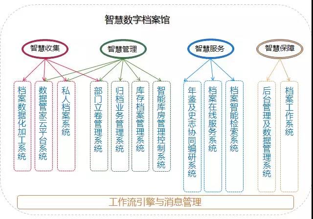 智慧数字档案馆内置工作流引擎与消息管理,分为智慧收集、智慧管理、智慧服务、智慧保障四大功能模块体系。